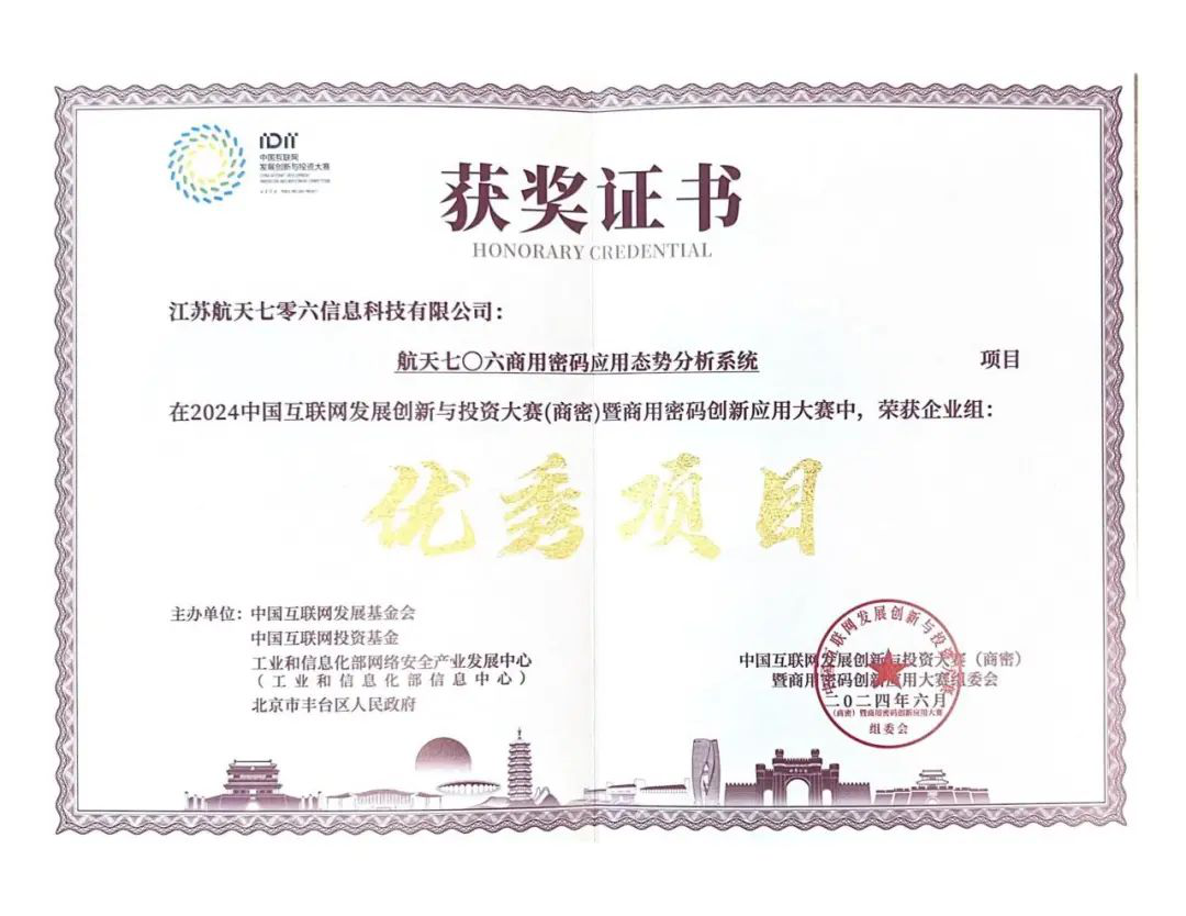 近日,2024中國互聯(lián)網(wǎng)發(fā)展創(chuàng)新與投資大賽(商密)暨商用密碼創(chuàng)新應用大賽圓滿落幕。航天二院706所江蘇公司“航天七〇六商用密碼應用態(tài)勢分析系統(tǒng)”榮獲企業(yè)組優(yōu)秀項目獎,充分彰顯了該公司在商用密碼領域突出的技術實力和創(chuàng)新能力。