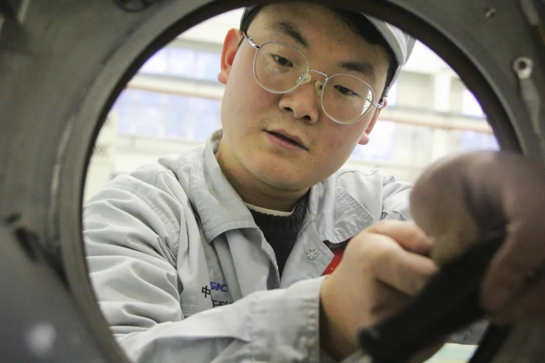 裝配車間內(nèi),負(fù)責(zé)首件產(chǎn)品艙段裝配工作的操作員楊振宇,正手持塞尺,對一部件的安裝間隙進(jìn)行裝后自檢。