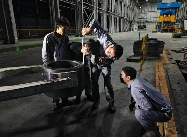 車間內(nèi),叉車的轟鳴奏響了奮斗的旋律。一位叉車司機(jī)熟練地操作設(shè)備,將鍛件穩(wěn)穩(wěn)抓起。4 名技術(shù)、生產(chǎn)骨干迅速圍攏過(guò)來(lái),手中的卷尺成為他們攻克技術(shù)難題的有力“武器”。他們專注地測(cè)量每一處尺寸,目光在鍛件與測(cè)量數(shù)據(jù)間來(lái)回切換,不放過(guò)任何一個(gè)細(xì)節(jié)。