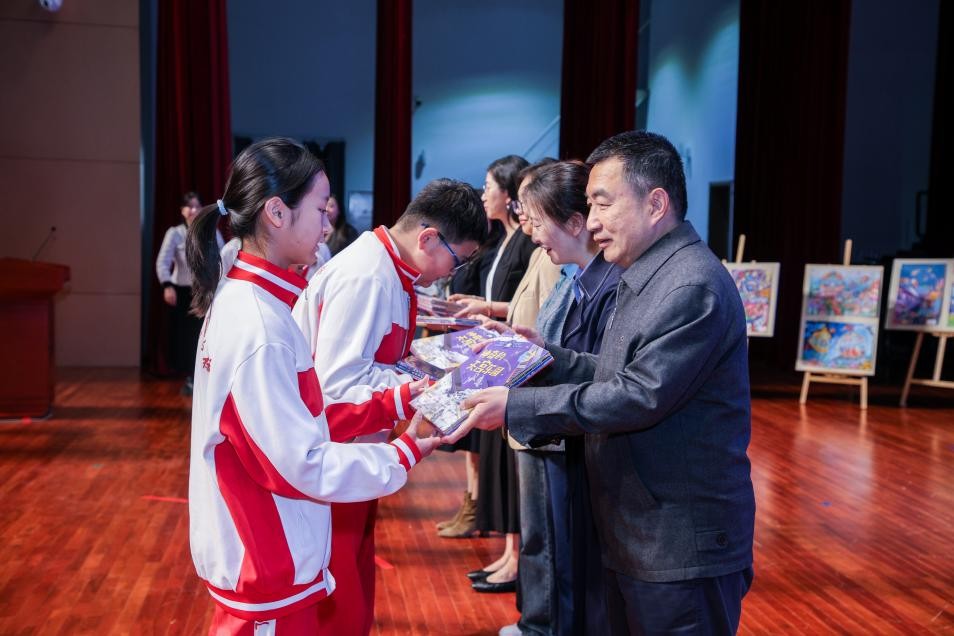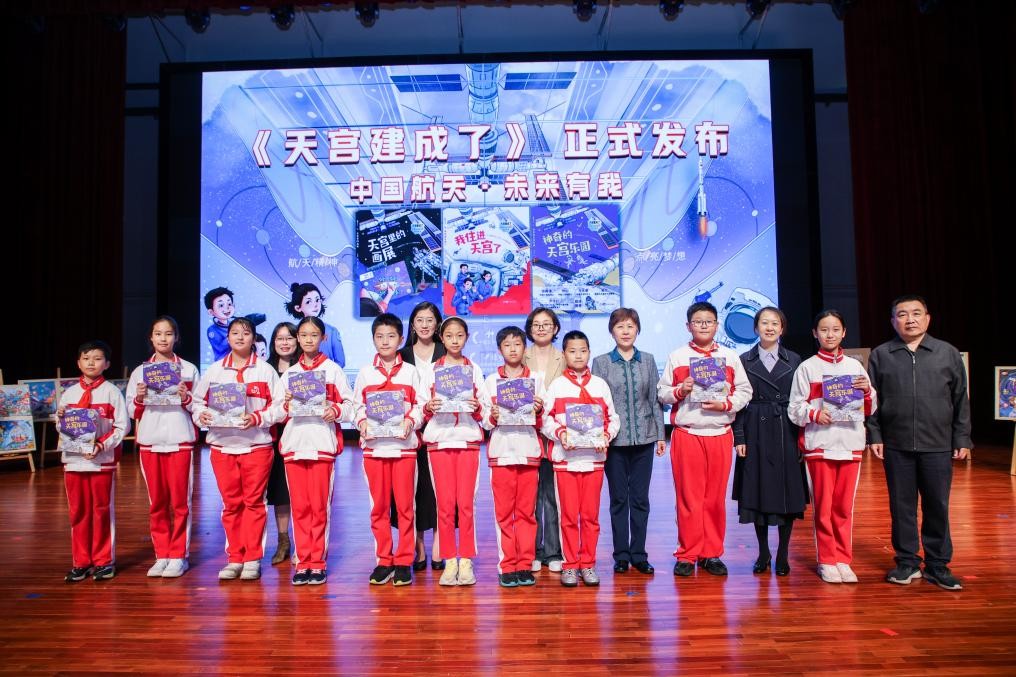 隨后,吳杰、沈立鳳與中國(guó)航天科工二院208所二級(jí)專務(wù)李曉紅共同觸摸啟動(dòng)球,主視覺(jué)大屏同步呈現(xiàn)繪本封面與“天宮建成了”主題字,標(biāo)志著這套入選“十四五”國(guó)家重點(diǎn)出版物出版規(guī)劃項(xiàng)目的科普繪本正式發(fā)布。緊接著的贈(zèng)書(shū)儀式上,與會(huì)嘉賓將繪本贈(zèng)予學(xué)生,為育英校園播撒下航天夢(mèng)想的種子。