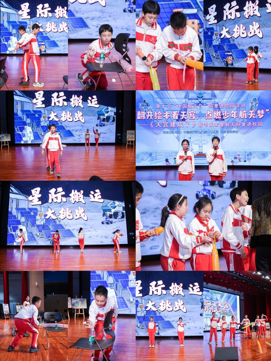 課堂末尾開(kāi)展的“星際搬運(yùn)大挑戰(zhàn)”更是將活動(dòng)推向高潮:學(xué)生通過(guò)“大象鼻子轉(zhuǎn)”游戲模擬航天員轉(zhuǎn)椅訓(xùn)練,并進(jìn)行趣味盎然的星際物資搬運(yùn)挑戰(zhàn);在火箭發(fā)射模擬賽中,大家通過(guò)放飛充氣氣球,直觀理解作用力與反作用力原理。此外,報(bào)告廳內(nèi)展示的育英學(xué)生科幻畫作品,營(yíng)造出濃厚的太空氛圍;作者分享的“天宮畫展”“少年拍天宮”,帶領(lǐng)青少年親臨發(fā)射場(chǎng)見(jiàn)證火箭發(fā)射等創(chuàng)作故事,讓航天知識(shí)更具人文溫度。