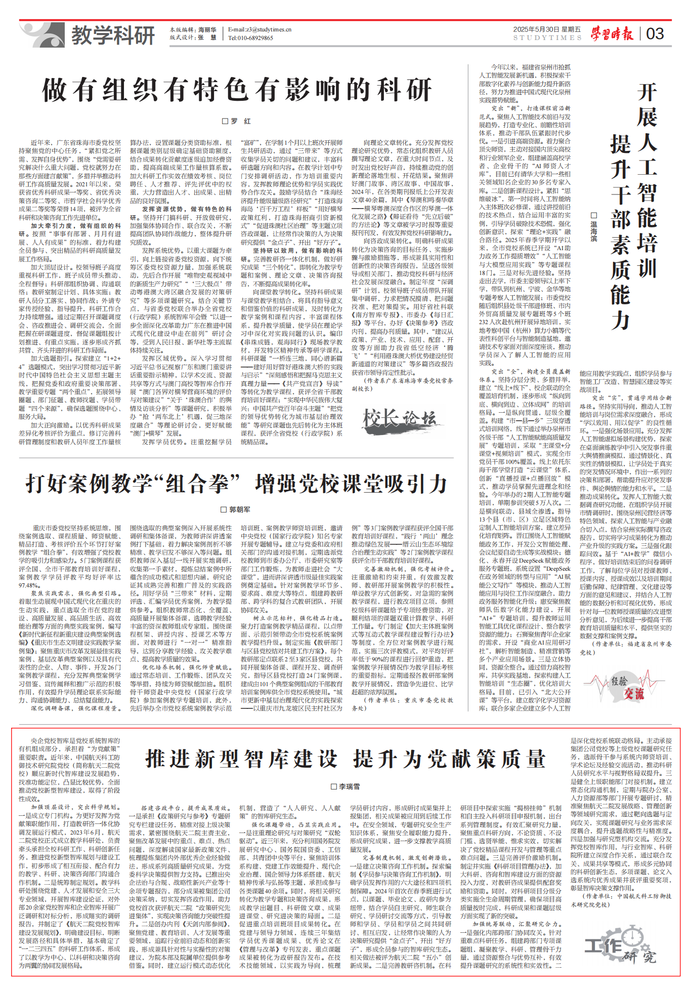 加強統(tǒng)籌聯(lián)動,匯聚研究合力。一是強化內(nèi)部跨部門協(xié)同攻關(guān)。針對重難點科研任務(wù),組建跨部門專項課題組,凝聚教學(xué)、科研、管理骨干力量,通過資源整合與優(yōu)勢互補,有效提升課題研究的系統(tǒng) 性和實效性。二是深化黨校系統(tǒng)聯(lián)動格局。主動承接集團公司黨校等上級黨校課題研究任務(wù),選派骨干參與系統(tǒng)內(nèi)師資培訓(xùn)、學(xué)術(shù)論壇及經(jīng)驗交流活動,推動科研人 員研究水平與視野格局雙提升。三是健全上級職能部門對接機制。建立常態(tài)化溝通機制,定期與院辦公室、人力資源部等部門開展專題研討,精準(zhǔn)聚焦航天二院發(fā)展 戰(zhàn)略、管理創(chuàng)新等領(lǐng)域研究需求,通過靶向選題與定向攻關(guān),實現(xiàn)課題研究與業(yè)務(wù)需求深度耦合,提升選題戰(zhàn)略性與精準(zhǔn)度。四是加強與研究型機構(gòu)交流。充分發(fā)揮 黨校智庫作用,與行業(yè)智庫、科研院所建立深度合作關(guān)系,通過聯(lián)合攻關(guān)、成果共享等模式,形成多元協(xié)同的科研創(chuàng)新生態(tài),多項課題、論文入選系統(tǒng)內(nèi)優(yōu)秀成果并 獲評重要獎項,彰顯智庫決策支撐作用。