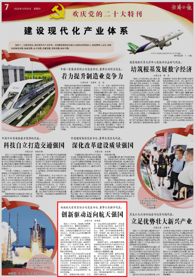 黨的二十大代表,湖南航天有限責(zé)任公司黨委書記、董事長(zhǎng)焦繼革表示,黨的二十大報(bào)告提出,建設(shè)現(xiàn)代化產(chǎn)業(yè)體系。這傳遞出我國(guó)建設(shè)現(xiàn)代化產(chǎn)業(yè)體系的決心,更為航天企業(yè)的高質(zhì)量發(fā)展按下“快進(jìn)鍵”。