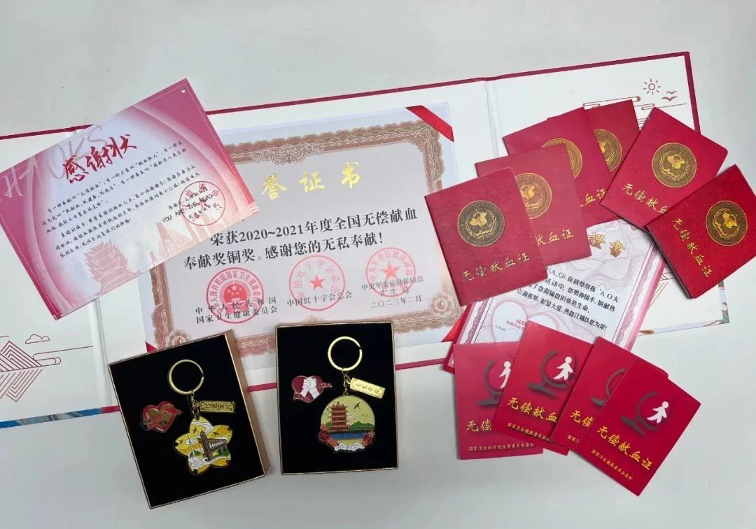 “2020-2021年度全國無償獻(xiàn)血奉獻(xiàn)銅獎(jiǎng)”“最佳履行社會公益責(zé)任獎(jiǎng)”……一本本獻(xiàn)血證、一張張榮譽(yù)證書、一封封感謝信,見證著分公司20年如一日,踐行救死扶傷、助人為樂的傳統(tǒng)美德,回報(bào)社會、奉獻(xiàn)社會的赤誠之心。(海報(bào)/高婕 文/財(cái)宣)