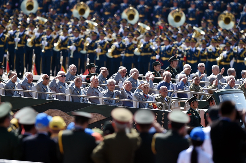 2015年9月3日,中國人民抗日戰(zhàn)爭暨世界反法西斯戰(zhàn)爭勝利70周年紀念大會在北京隆重舉行。這是抗戰(zhàn)老兵乘車方隊通過天安門廣場。新華社記者 王定昶 攝