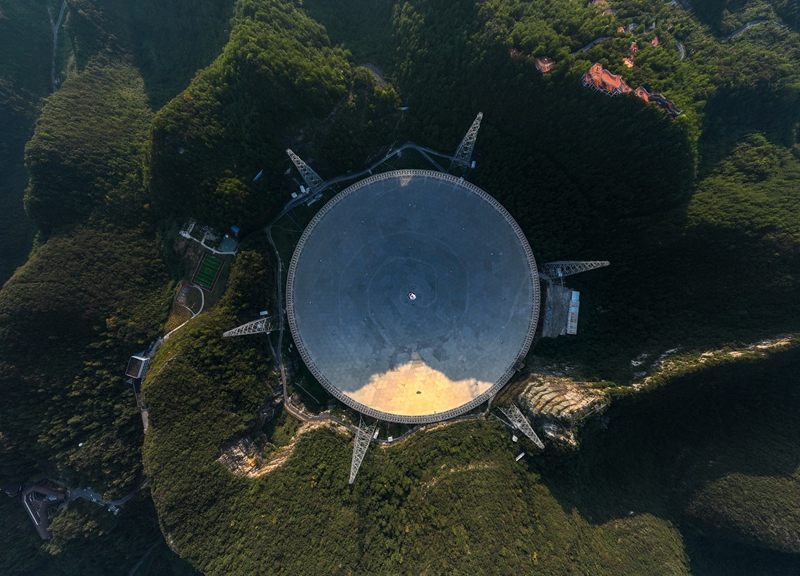 中國天眼在落日余暉中(無人機照片,維護保養(yǎng)期間拍攝,2024年9月25日攝)。新華社記者 劉續(xù) 攝