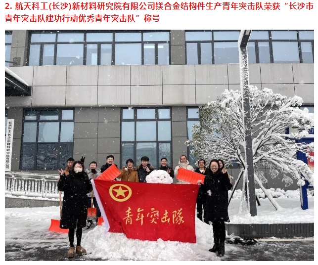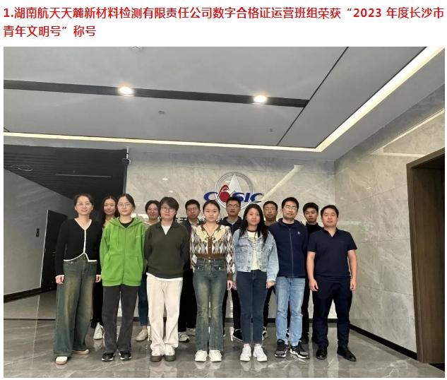 湖南航天天麓新材料檢測有限責任公司數(shù)字合格證運營班組獲評“2023年度長沙市青年文明號”稱號;航天科工(長沙)新材料研究院有限公司鎂合金結(jié)構(gòu)件生產(chǎn)青年突擊隊獲評“長沙市青年突擊隊建功行動優(yōu)秀青年突擊隊”稱號;航發(fā)公司周紅獲評“2023 年度長沙市青年崗位能手”稱號。