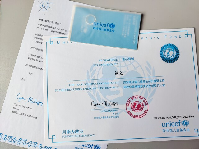 2021年1月14日,一封來自聯(lián)合國兒童基金會(UNICEF)駐華代表處的快遞寄到欽文手中,里面有一枚戒指和一封聯(lián)合國兒童基金會駐華代表親筆簽名的感謝信。欽文說,這是最好的禮物。一定要將這件事堅持做下去。