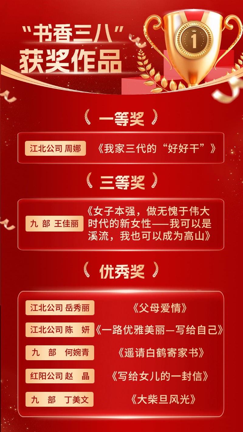 近日,全國第十二屆“書香三八”讀書活動獲獎名單揭曉,航天科工九院工會委員會獲得“優(yōu)秀組織獎”,個人獲獎作品7篇,其中一等獎1篇、三等獎1篇、優(yōu)秀獎5篇。