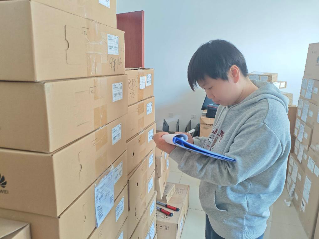 在倉(cāng)庫(kù)盤(pán)點(diǎn)設(shè)備機(jī)型的詹姐